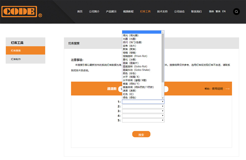 根据灯具的通道表输入“通道数”,并选填部分或全部的通道资料,然后点击“搜索”按键,轻松几步就能快速找到合适的系统灯库。