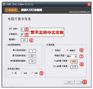 (2)填写厂家名称、灯具型号、通道数、彩色混合模式、灯具类型等基本信息。