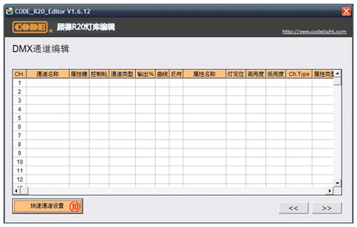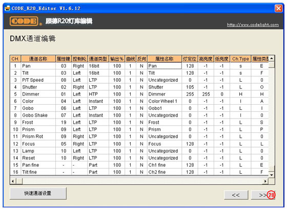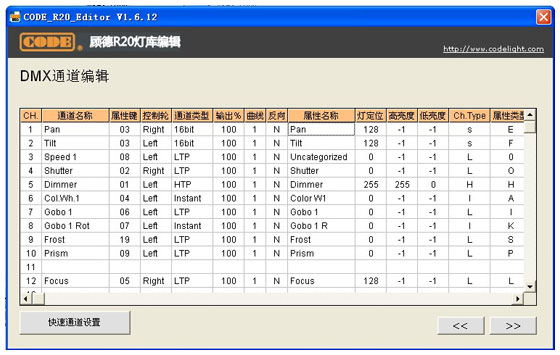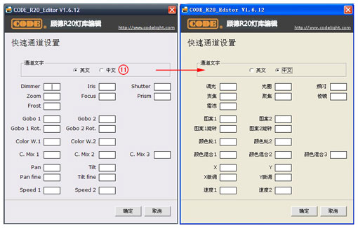 "快速通道设置"界面可选择中英文显示模式,但是这并不意味着生成的灯库文件也会显示为中文,因为R20文件暂时还不支持中文字体,中英文显示模式只是为了照顾不懂英文单词的用户,使得大家在编辑通道时能够方便一些。