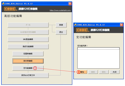 用户如果需要在灯库里面增加"范围表"、"素材表"和"宏功能"的部分,那么可以在保存为R20文件之前进行相应的"高级功能编辑"。